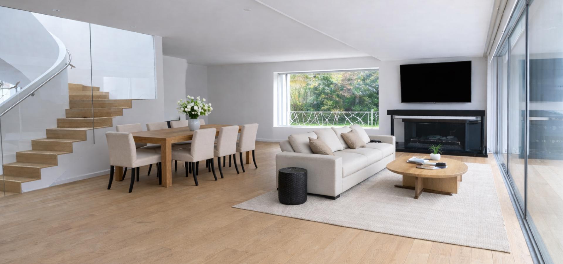- Un vaste séjour et une salle à manger, avec cheminée et accès direct à l’extérieur ;