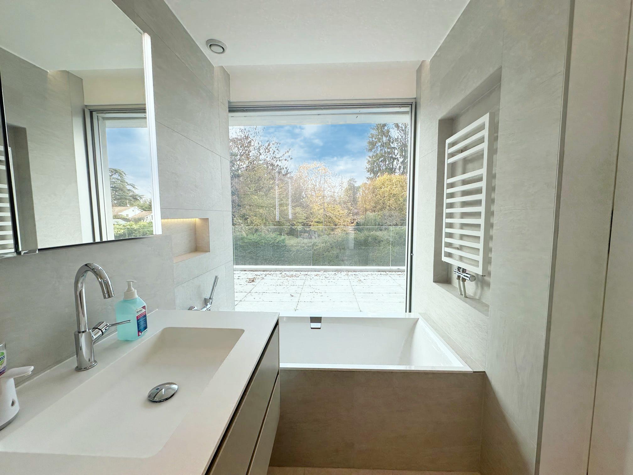 - Une spacieuse chambre principale avec coin dressing et salle de bains attenante (baignoire, douche, lavabo, WC), ouvrant directement sur la terrasse ;