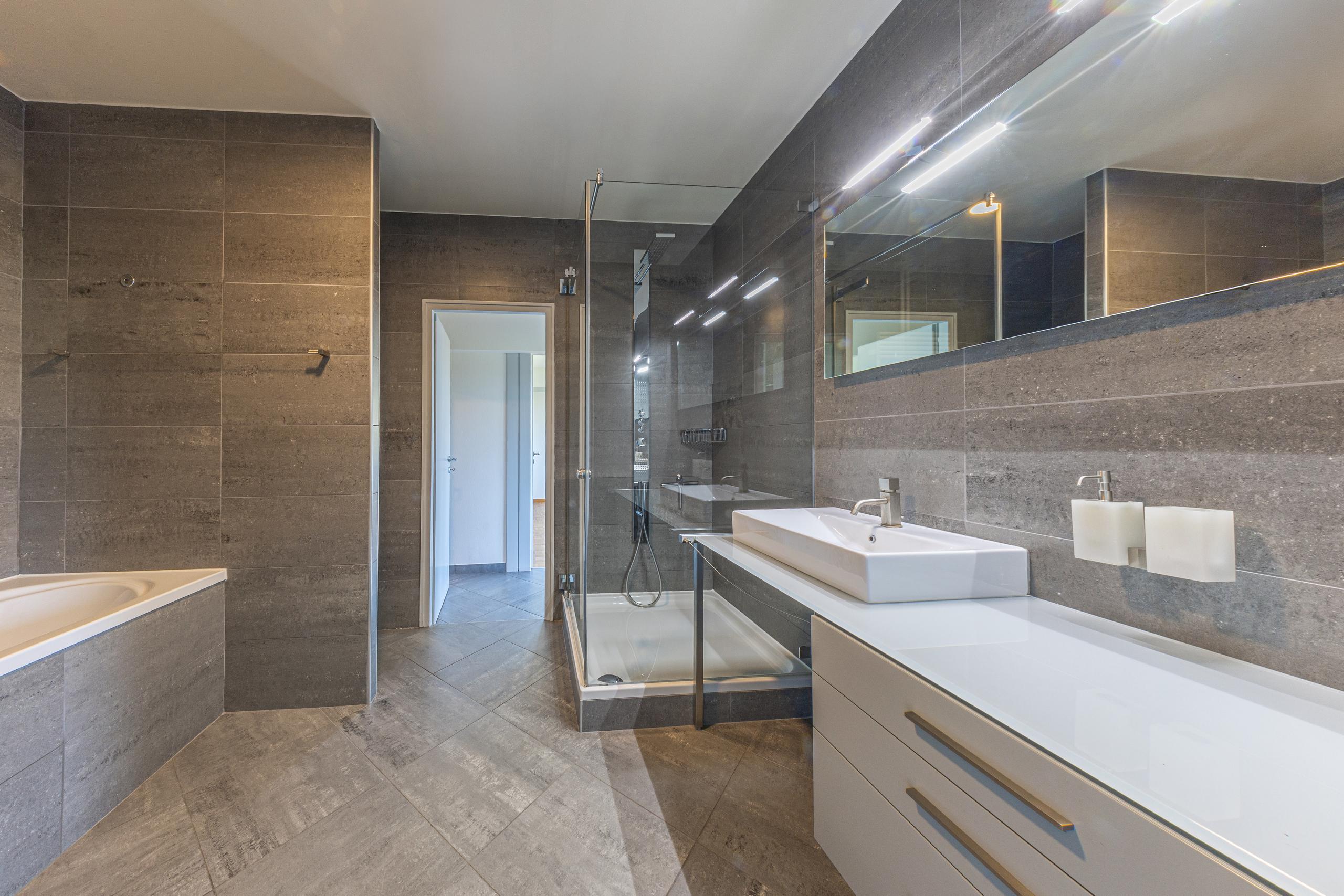 - Une grande salle de bains (douche, baignoire, lavabo, radiateur) ;